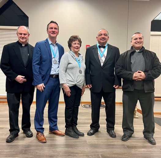 The recipients of the 2023 Mater Dei award: Derek Rotty, Kathy Jarvis and Manuel Cobian. They are pictured above with our pastor, Father David Graham and associate pastor, Father Jonathan Perez.