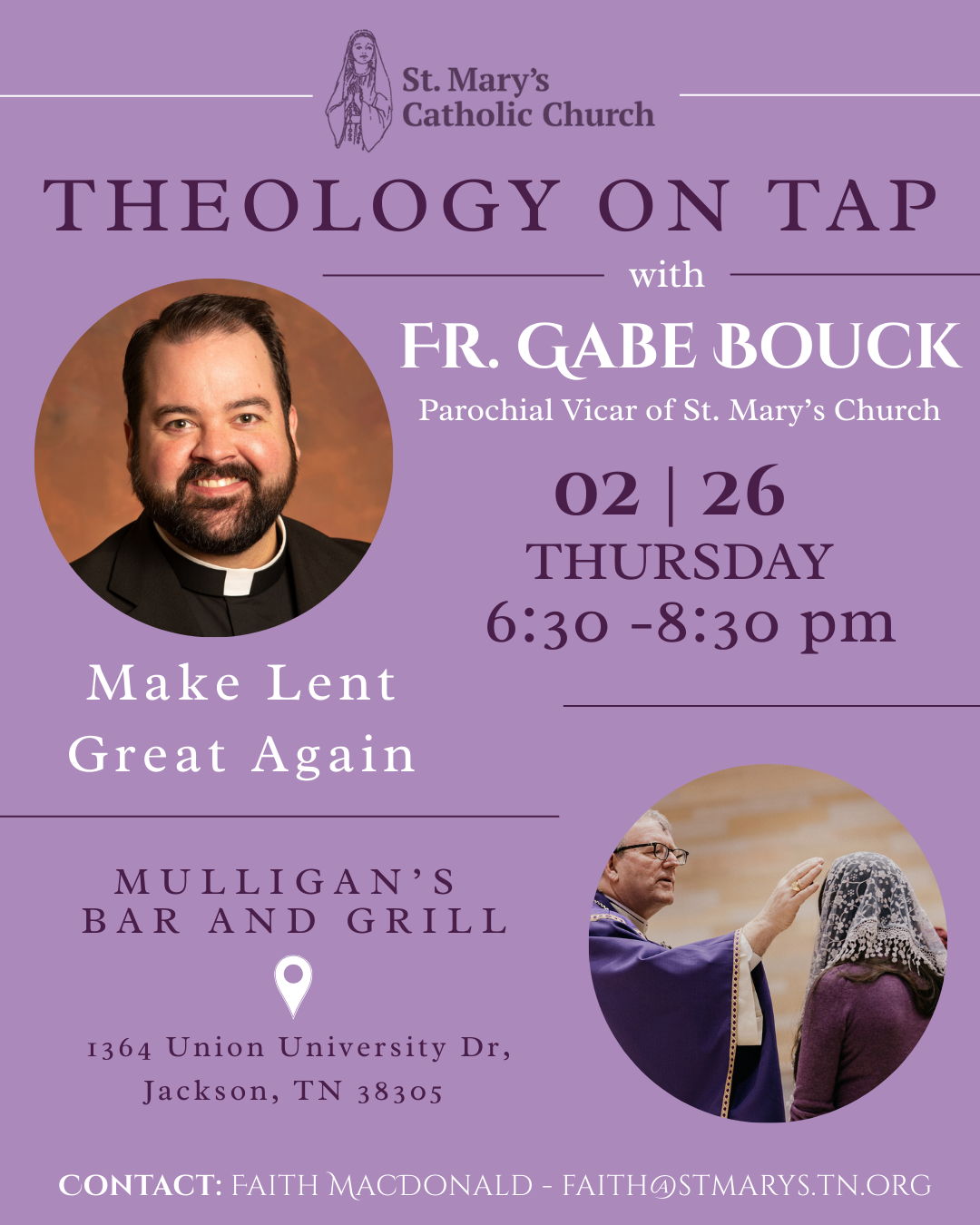 Our Next Theology on Tap will be at Mulligans on Thursday, April 23rd from 6:30-8:30p